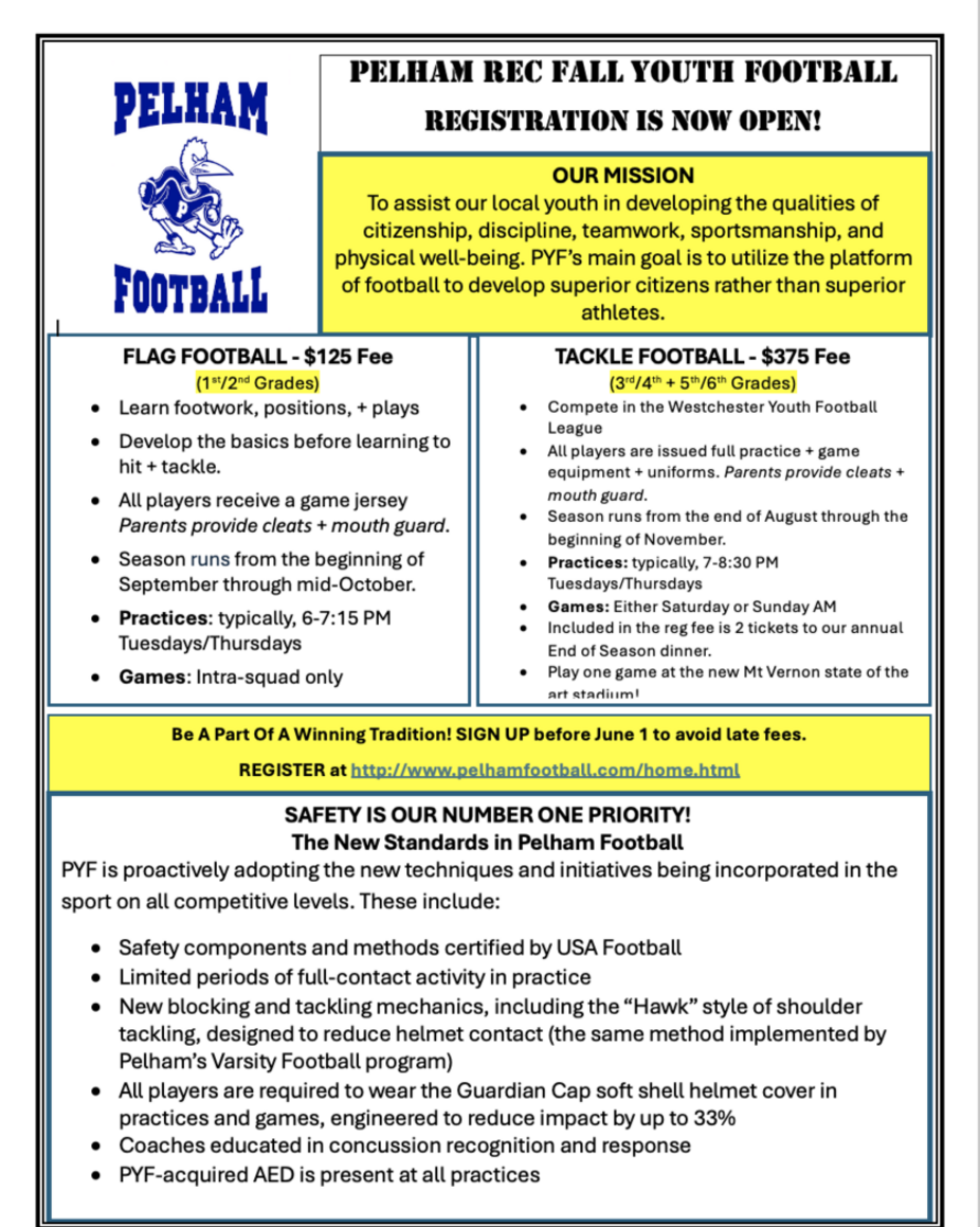 Late fee of $50 for tackle (3rd-6th grade) starting on 6/1.